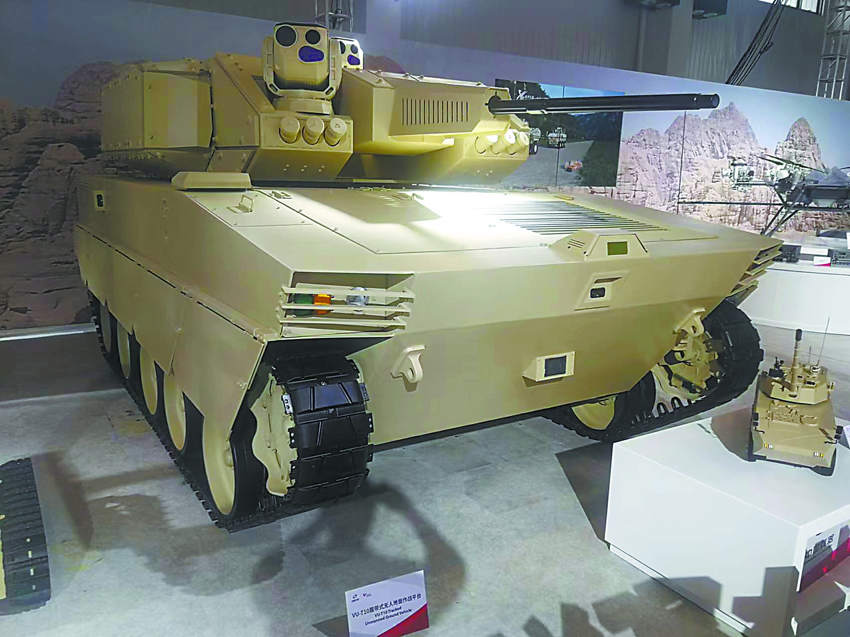 相比各種無(wú)人機(jī)和巡飛彈,珠海航展上的無(wú)人地面作戰(zhàn)車輛在作戰(zhàn)性能上也毫不遜色。除了VT-5U輕型坦克可以臨時(shí)客串“無(wú)人坦克”外,兵器工業(yè)集團(tuán)的VU-T10履帶式無(wú)人地面作戰(zhàn)平臺(tái)也堪稱重型無(wú)人車輛。VU-T10主要針對(duì)城市環(huán)境作戰(zhàn),選擇采用厚重的履帶式底盤,配備有30毫米口徑遙控武器站,未來(lái)還可以根據(jù)需要配備4枚“紅箭-12”反坦克導(dǎo)彈,加載7.62毫米機(jī)槍,其武器配備的豐富程度相比俄羅斯BMPT“終結(jié)者”火力支援車也不遜色,卻沒(méi)有了后者在巷戰(zhàn)中可能遭遇人員傷亡的風(fēng)險(xiǎn)。