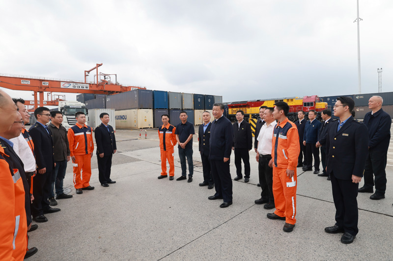 4月22日至24日,中共中央總書記、國家主席、中央軍委主席習(xí)近平在重慶考察。這是22日下午,習(xí)近平在重慶國際物流樞紐園區(qū)重慶鐵路集裝箱中心站,同貨車司機、列車司機、裝卸工人、場站管理人員等親切交流。