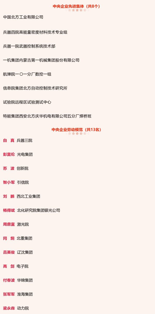 兵器工業(yè)集團(tuán)8個(gè)集體和13名個(gè)人獲中央企業(yè)先進(jìn)集體和勞動模范表彰